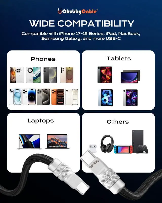 | Compatible Devices | Compatible with iPhone 17-15 Series, MacBook Pro/Air, iPad Pro/Air/Mini, iMac, Mac Studio, Mac Mini, Samsung Galaxy S Series (S24/S23 and more), Galaxy Z Flip/Z Fold Series, Galaxy Tab Tablets, Google Pixel Phones, Huawei, Xiaomi, Microsoft Surface, USB-C Laptops, Tablets, Switch, Steam Deck, Bluetooth Headphones, Smartwatches, Power Banks, Car Chargers, and more. |