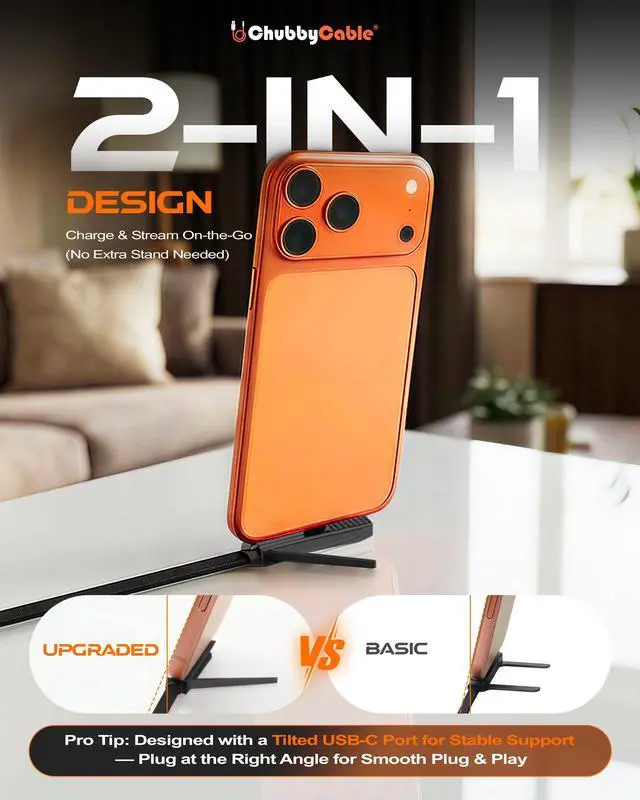 Upgraded 2-in-1 Stand & Cable Design: Ergonomic 16° fixed vertical tilt provides a comfortable viewing experience, paired with a stable multi-angle adjustable structure for horizontal use. The extended Type-C port and slim base also fit more phone cases, delivering both comfort and stable support