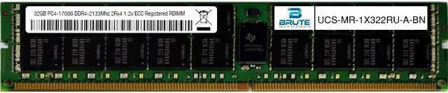 Cisco Compatible UCS-MR-1X322RU-A - 32GB PC4-17000 DDR4-2133Mhz 2Rx4 1.2v Registered RDIMM UCS-MR-1X322RU-A-BN is a Cisco compatible 32GB PC4-17000 DDR4-2133Mhz 2Rx4 1.2v Registered RDIMM, equivalent to Cisco labeled PN#: UCS-MR-1X322RU-A. Brute Networks modules are all major brand (Samsung, SK Hynix, or Micron). This module is guaranteed compatible with your server, as well as guaranteed to maintain your factory warranty, since Brute Networks modules are from the same manufacturers Cisco uses for their OEM branded modules.