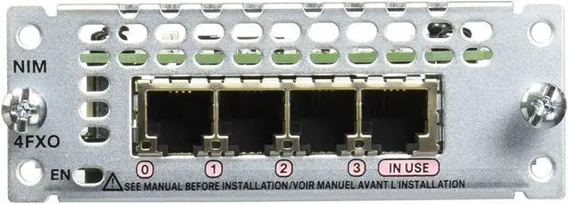 Cisco Fourth-Generation Network Interface Module - Voice / fax module - analog ports: 4 Application/Usage: Voice Product Type: Voice Interface Card (VIC) Interfaces/Ports Details: 4 x FXO Product Type: Voice Interface Card (VIC) Compatibility: Cisco 4451-X Integrated Services Routers Manufacturer Part Number: NIM-4FXO= Interfaces/Ports Details: 4 x FXO Network Manufacturer: Cisco Systems, Inc Product Name: Voice Interface Card (VIC) Brand Name: Cisco Brand Name: Cisco