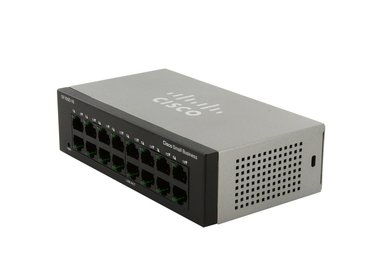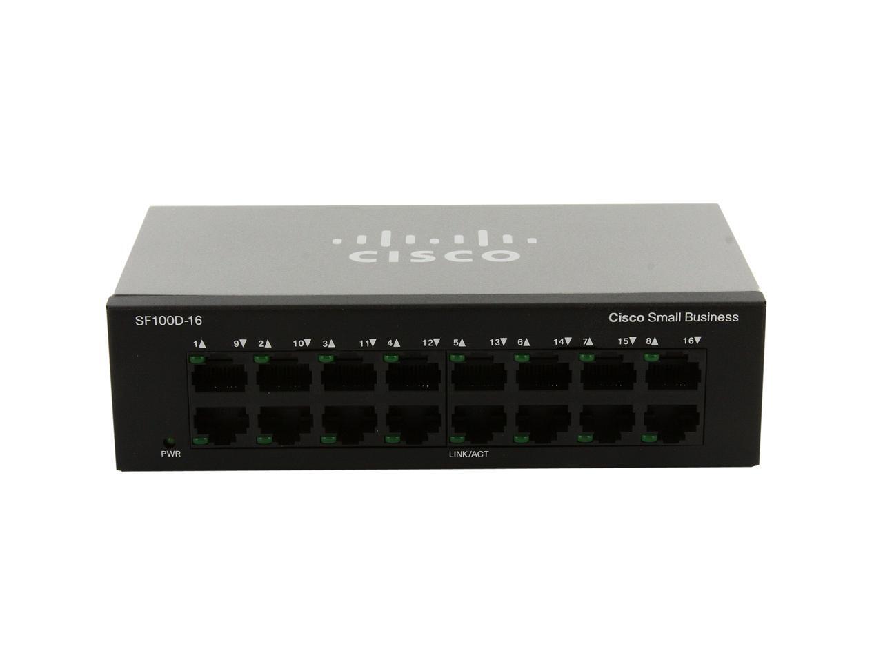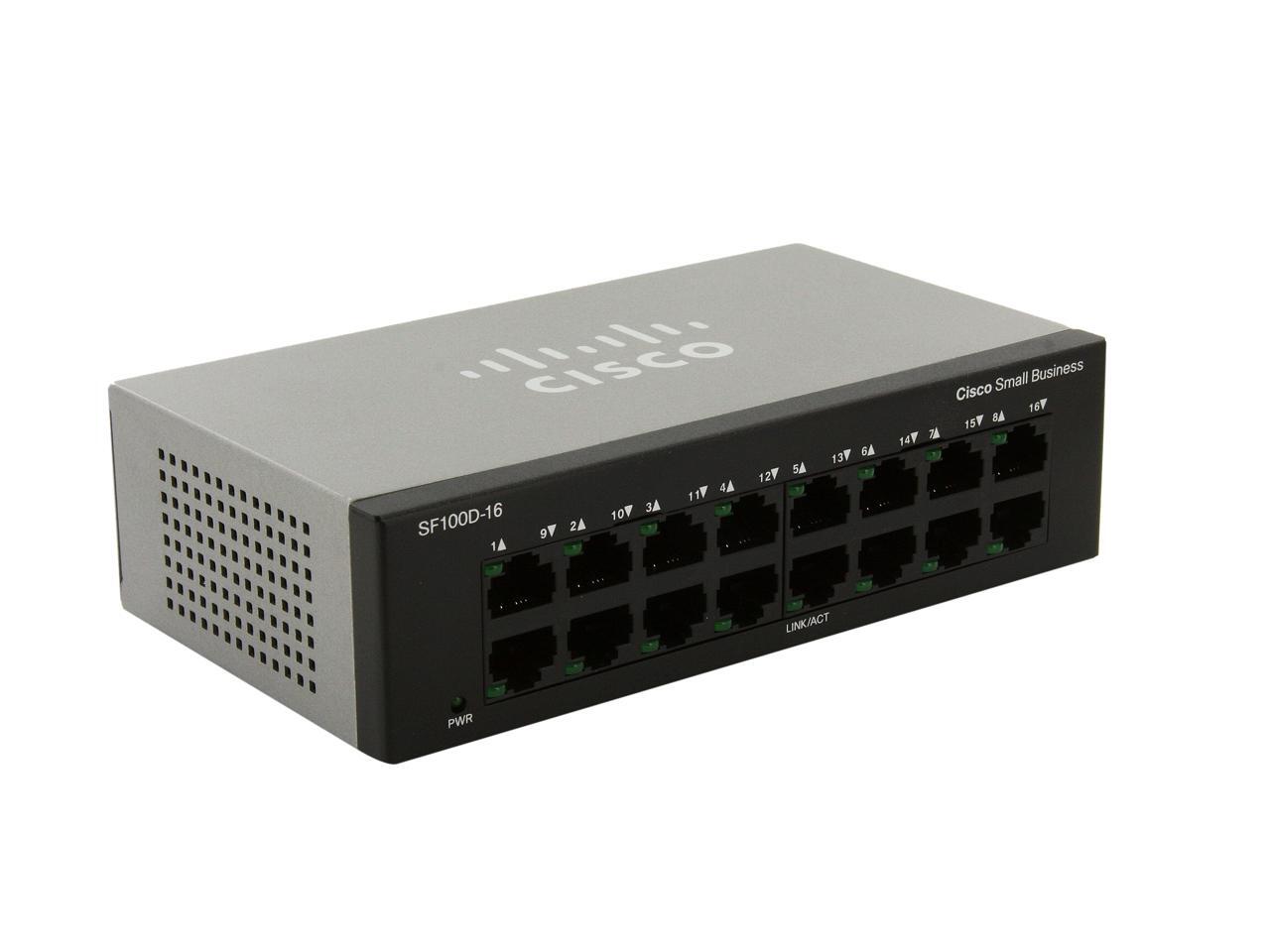The Cisco SF100D-16 16-Port 10/100 Switch is an unmanaged switch that offers the performance and ease of use needed to connect small businesses. Use this desktop switch to connect up to 16 computers, printers, or wireless access points to the network, as well as to share network resources such as servers and network-attached storage. The switch works right out of the box and does not require any management or configuration. Quality of service (QoS) enhances network performance and improves voice and video quality. The switch optimizes power efficiency and features Energy Efficient Ethernet, which reduces energy consumption without compromising performance. The Cisco SF100D-16 delivers the reliability and performance needed to keep the network running smoothly and is protected by a limited lifetime warranty.