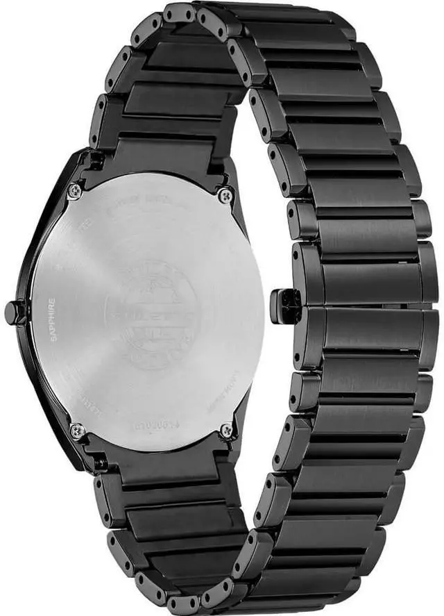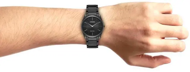 Eco-Drive Technology: Solar powered watch. Charges with light, Never requires battery or battery replacement. Black steel Ultra-thin case. Black steel link bracelet. Black dial.