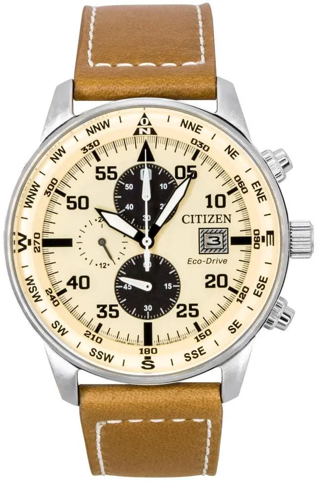 Citizen Eco-Drive Aviator Chronograph Leather Strap Beige Dial CA0880-15X 100M Men's Watch