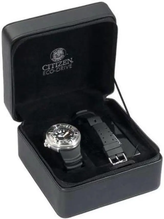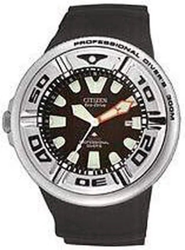 Citizen Eco-Drive Promaster Professional Diver is used for mixed gas diving with its 6mm non-reflective curved crystal, ratcheted elasped-time bezel, screw-back case & screw-down crown, and reinforced urethane band and extender, with a carrying case for the wetsuit strap extension. Crafted in stainless steel with luminious accents, and 300M WR.