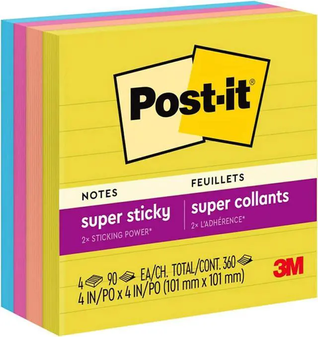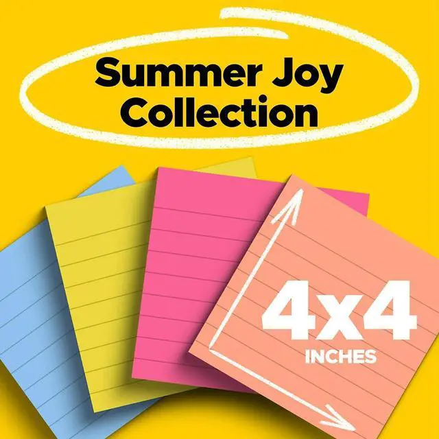 Summer colors at their most warm and invitingcapture happy memories that will last all year. Super Sticky adhesive provides twice the sticking power, yet always ensures that your notes will remove cleanly, no matter where you place them. Stick and re-stick to just about any flat surface: doors, windows, mirrors, walls and more to make sure your thoughts get noticed. If working or learning remotely, be sure to download the free Post-it App to leverage the apps features to help you capture ideas, track tasks, create colorful calendars and more. The app also allows you to share everything between your syncd devices as well as across a wide variety of platforms: Dropbox, Trello, PowerPoint and more. Pad Type: Super-Sticky; Shape: Square; Color(s): Summer Joy Collection; Color Family: Multicolor.