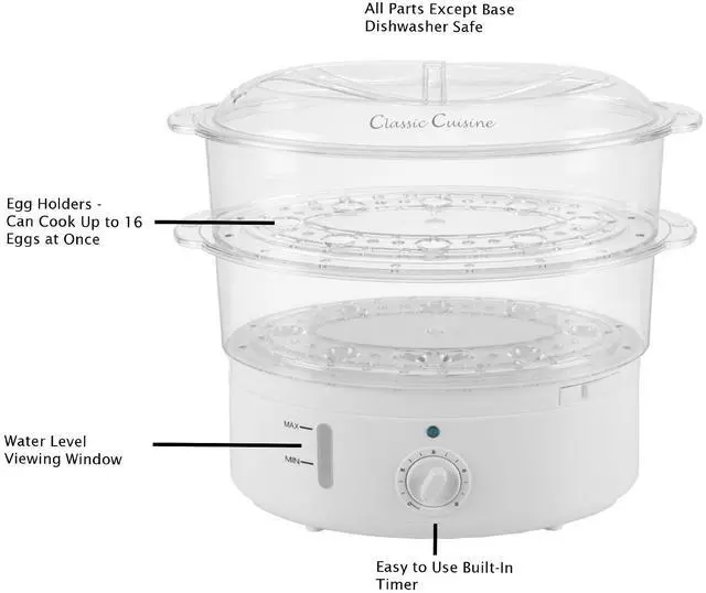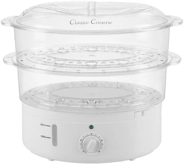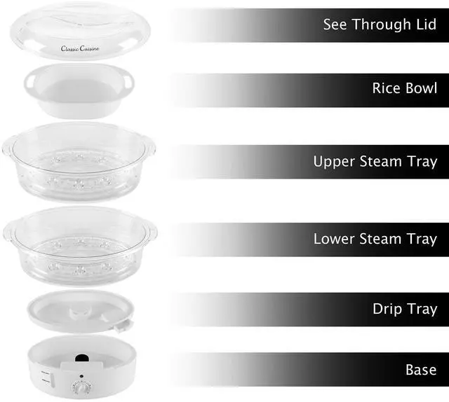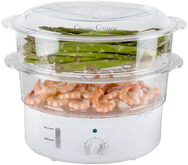 This Electric Steamer by Classic Cuisine is designed to steam vegetables, meat, and fish to perfection with no added fat required, preserving their nutrients and taste, while also cooking fluffy and evenly textured rice. With the included rice bowl and 2 steam trays, this 2-tier food steamer truly offers a wide range of cooking options. The built-in timer and included cooking guide eliminate guesswork for fast, easy meals.