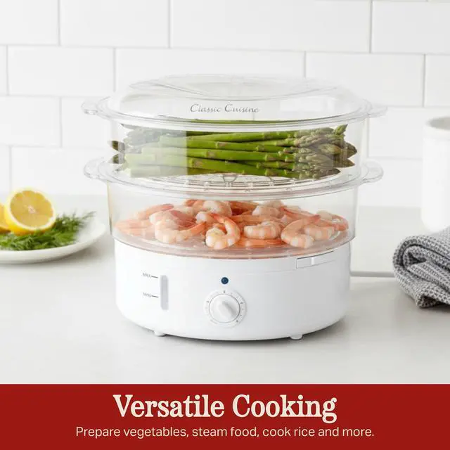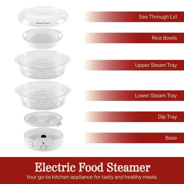 This Electric Steamer by Classic Cuisine is designed to steam vegetables, meat, and fish to perfection with no added fat required, preserving their nutrients and taste, while also cooking fluffy and evenly textured rice. With the included rice bowl and 2 steam trays, this 2-tier food steamer truly offers a wide range of cooking options. The built-in timer and included cooking guide eliminate guesswork for fast, easy meals.