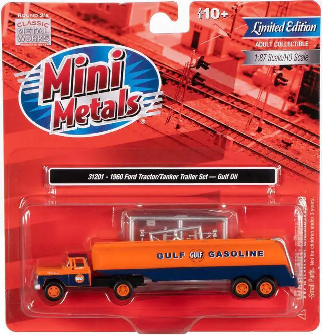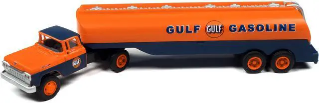 Brand new 1/87 (HO) scale truck model of 1960 Ford Tanker Truck Orange and Blue "Gulf Oil" model truck by Classic Metal Works.