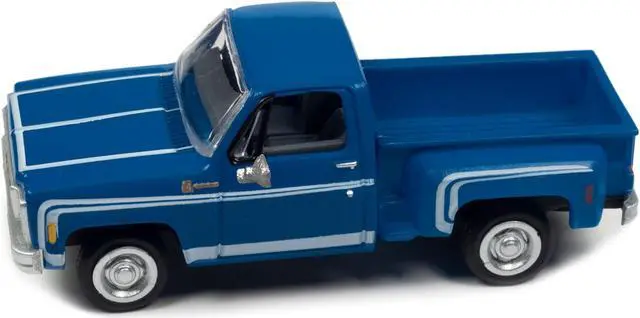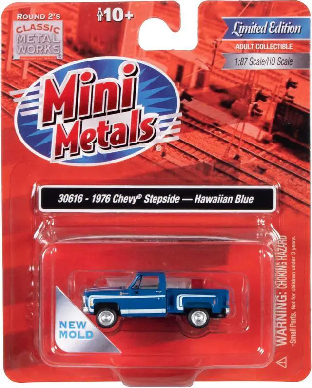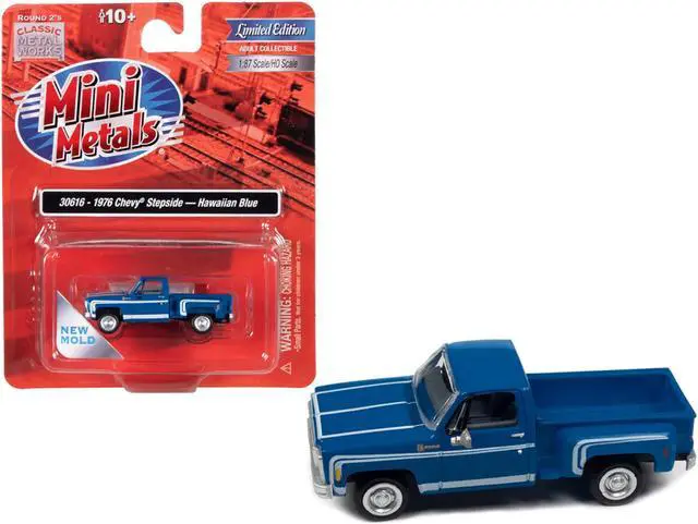 Brand new 1/87 (HO) scale car model of 1976 Chevrolet Stepside Pickup Truck Hawaiian Blue with White Stripes model car by Classic Metal Works.
