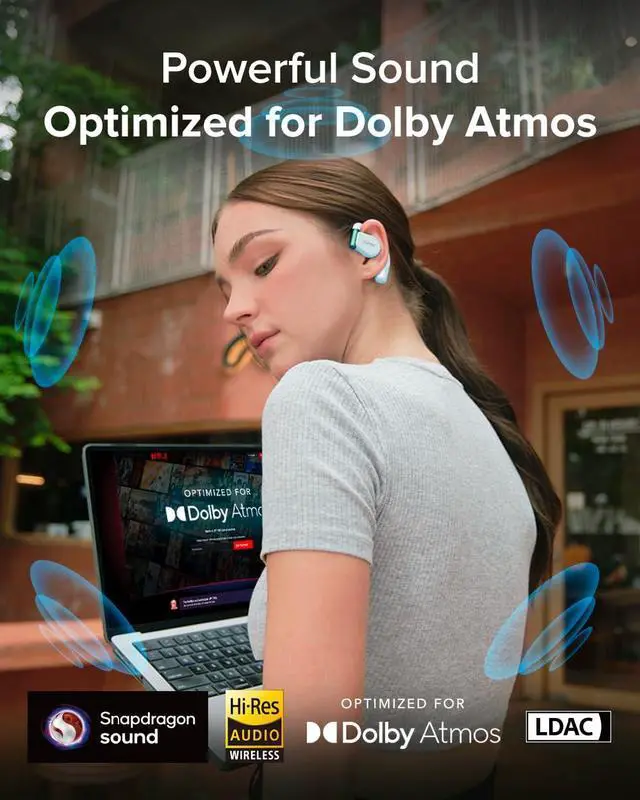 Get the best-yet audio quality of our open-ear earbuds. Arc 3 features 16.2mm Graphene Drivers powered by Snapdragon Sound for Hi-Res certified listening. Hear the crisp details of your music along with improved bass performance.