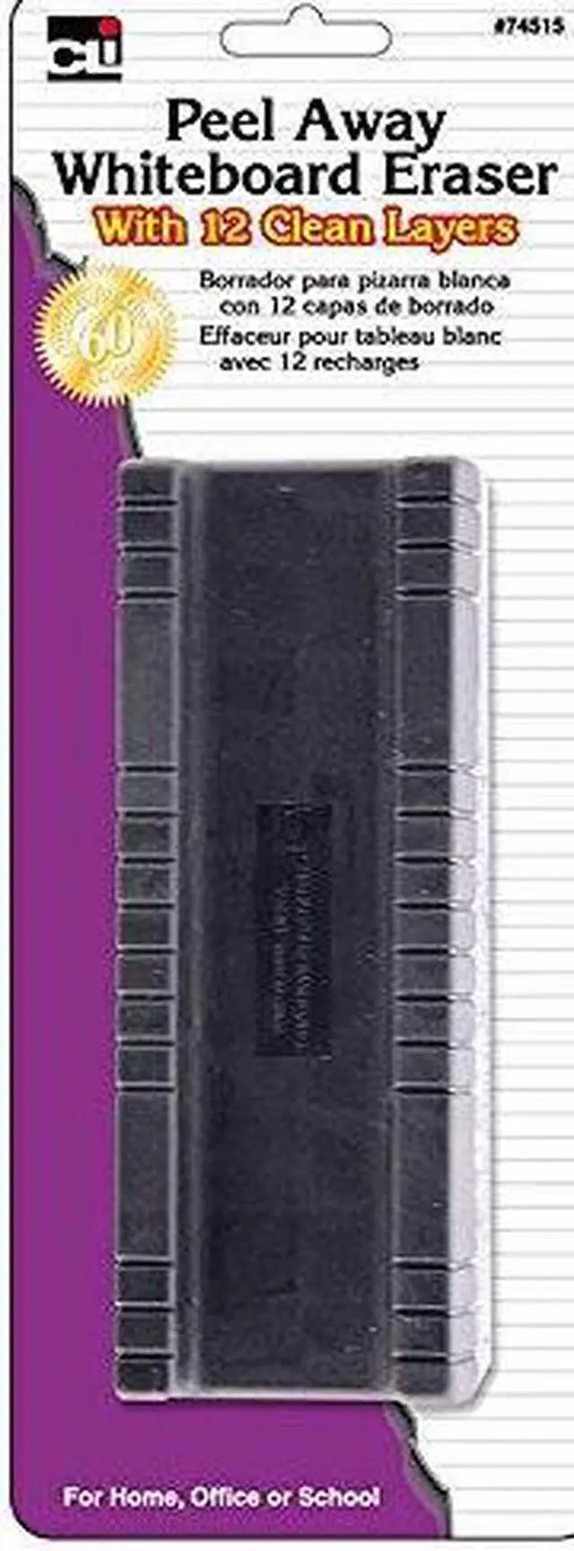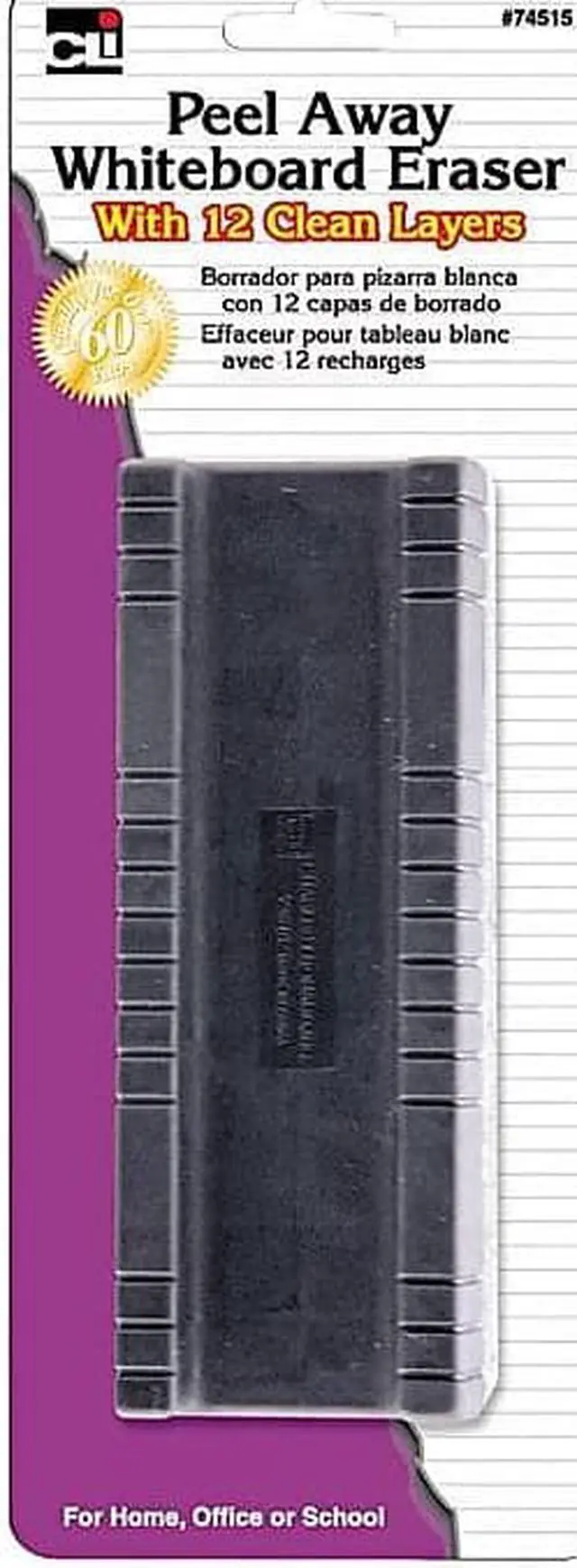 Whiteboard eraser features a peel-away design that lets you conveniently remove used pads. 12 peel-away felt layers offer multiple clean surfaces to increase your cleaning efficiency. Easy-grip handle is comfortable to use.