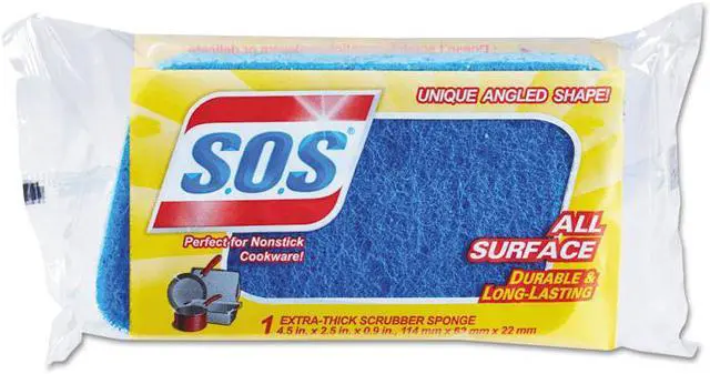 S.O.S All Surface Scrubber Sponge is dual-sided for cleaning both heavily soiled and delicate surfaces. Its durable and long-lasting for everyday use with the scrubbing power on one side to cut through tough messes and a soft absorbent cellulose sponge on the other to clean delicate surfaces including non-stick cookware, marble, ceramic and tile. The all-surface sponge features an easy-to-hold shape that allows you to clean hard-to-reach crevices faster and easier. This sponge is also dishwasher safe so you can toss it in the top rack to conveniently sanitize. Ideal for use in restaurants, cafeterias, hotels, break rooms and other commercial facilities. Cleaning is quick and easy with S.O.S. Sponge Type: Scrub Pad; Material(s): Cellulose; Scrim; Shape: Parallelogram; Width: 2.5".