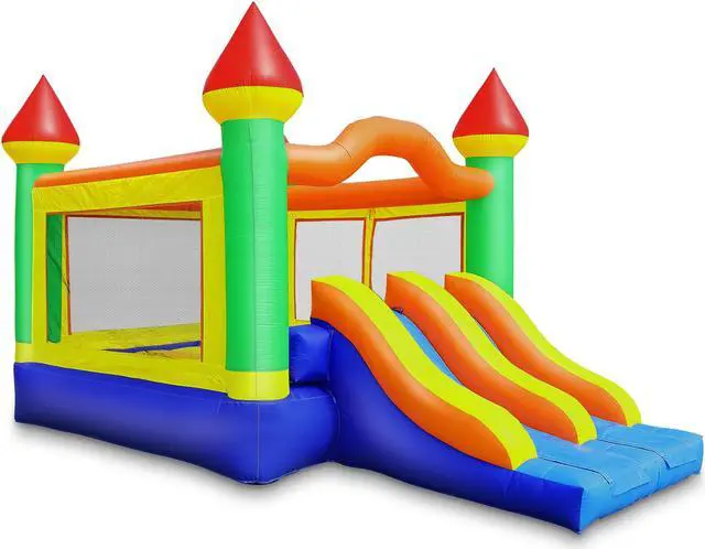 Cloud 9s commercial-grade Mega Double Slide Bounce House is a large inflatable bounce house. Constructed from heavy-duty, 100% PVC vinyl, from its upright pillars and beams to its slide walls. All high-stress areas, including the bouncing surface, mattress sides, bottom, and slide are made from industrial strength, 15-ounce ( 0.47 mm) PVC. This (fire retardant and lead-free) puncture-proof PVC material is approximately 5 times stronger than the nylon used in inferior units. The PVC will not tear, fade, get moldy, and is far easier to clean.