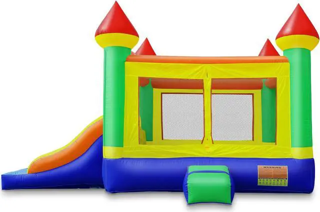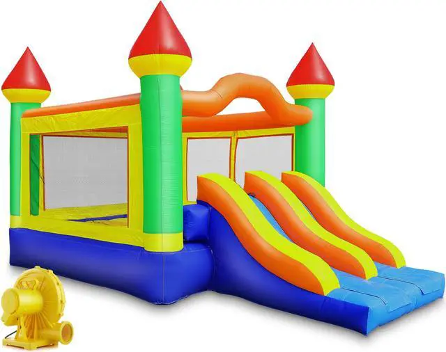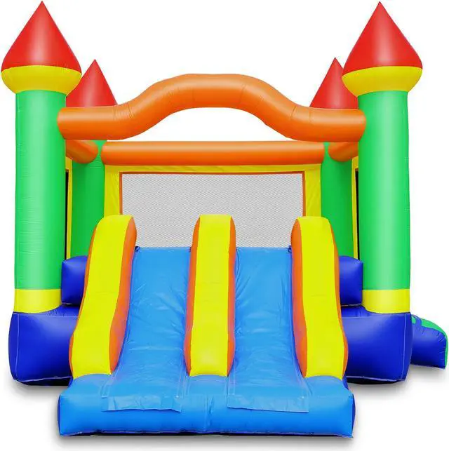 Cloud 9s commercial-grade Mega Double Slide Bounce House is a large inflatable bounce house. Constructed from heavy-duty, 100% PVC vinyl, from its upright pillars and beams to its slide walls. All high-stress areas, including the bouncing surface, mattress sides, bottom, and slide are made from industrial strength, 15-ounce ( 0.47 mm) PVC. This (fire retardant and lead-free) puncture-proof PVC material is approximately 5 times stronger than the nylon used in inferior units. The PVC will not tear, fade, get moldy, and is far easier to clean.