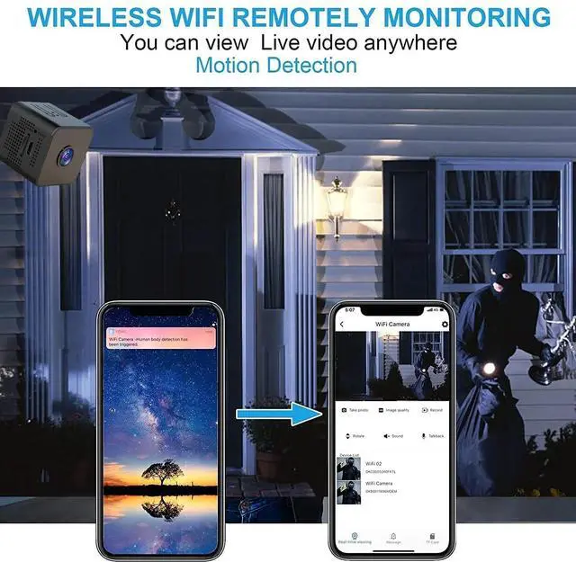 This WiFi security camera allow you to remotely view through phone app. You can use it to monitor your house, warehouse, shop, office, kids, pets. And this camera can record videos without WiFi. Protect your property and family 7x24 hours.