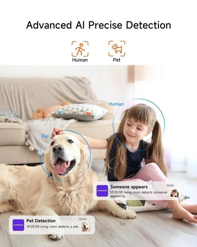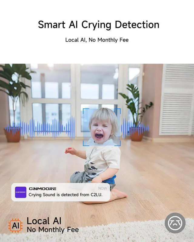 Smart Local AI Detection, Zero Subscription: Our home camera automatically identifies crucial moments: a person's presence, pet movements, or your baby's cries. All processed locally, no cloud fees, no hidden costs. Why pay monthly fee elsewhere when our AI alerts are FREE for life?