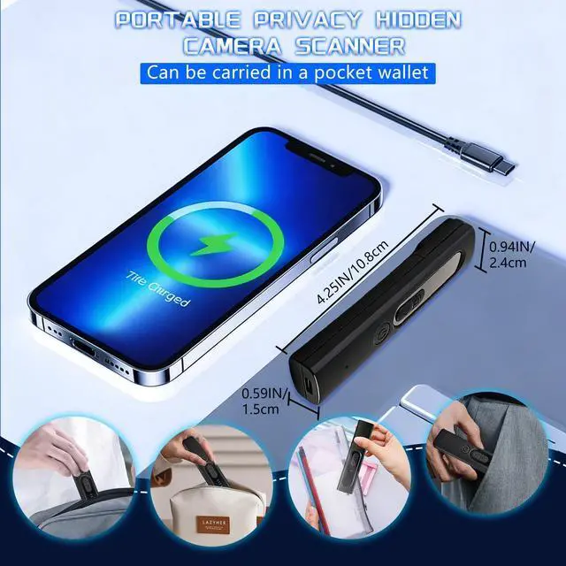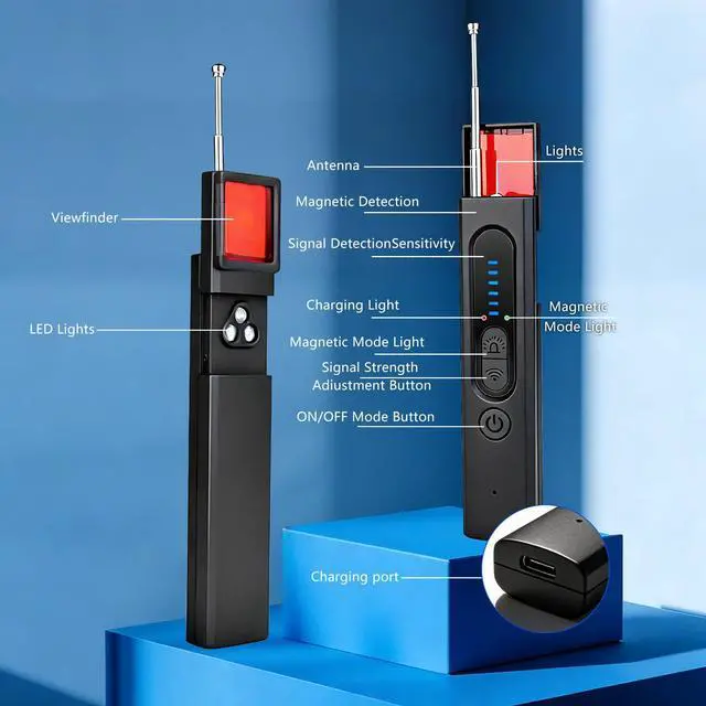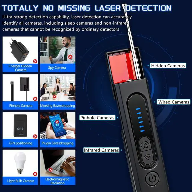4 Detection ModesThe hidden camera detector can detect various surveillance or listening devices: 1. Strong Magnetic GPS Detection: Locates undiscovered GPS trackers or hidden GPS locators. 2. Wireless Signal Detection: Detects active eavesdropping devices like transmitting cameras or trackers. 3. Camera Lens Detection: Discovers hidden pinhole cameras. 4. Flashlight Mode: Use this mode to detect cameras in dark environments or as a simple lighting tool.