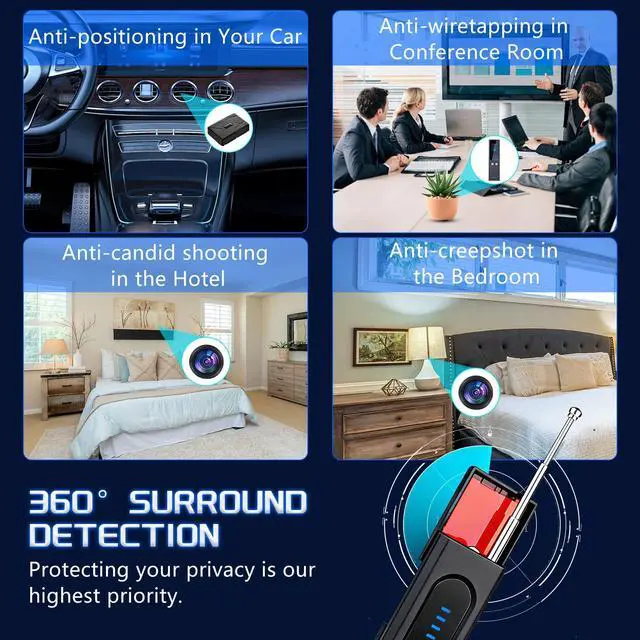 Multi-Band Detection: The hidden camera detector operates across a frequency range of 1MHz to 6.5GHz, including GSM, 3G, 4G, 5G, Bluetooth, and Wi-Fi bands (2.4GHz and 5.8GHz). It provides comprehensive security protection for user privacy, helping you locate and identify hidden devices faster and more accurately to safeguard your privacy and important information.