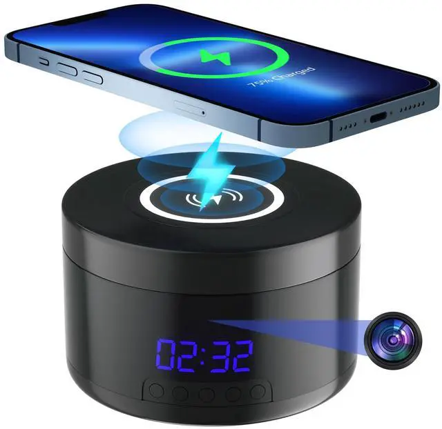 Indoor Camera with Clock and Wireless Charging, 1080P WiFi Cameras for Home, Security Camera with Motion Detection, Night Vision, Local & Cloud Storage,with APP (Black)