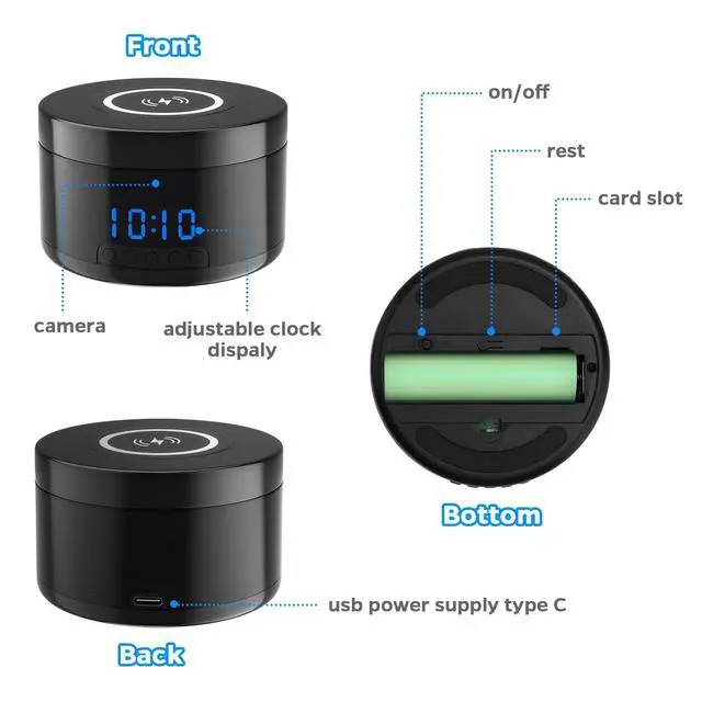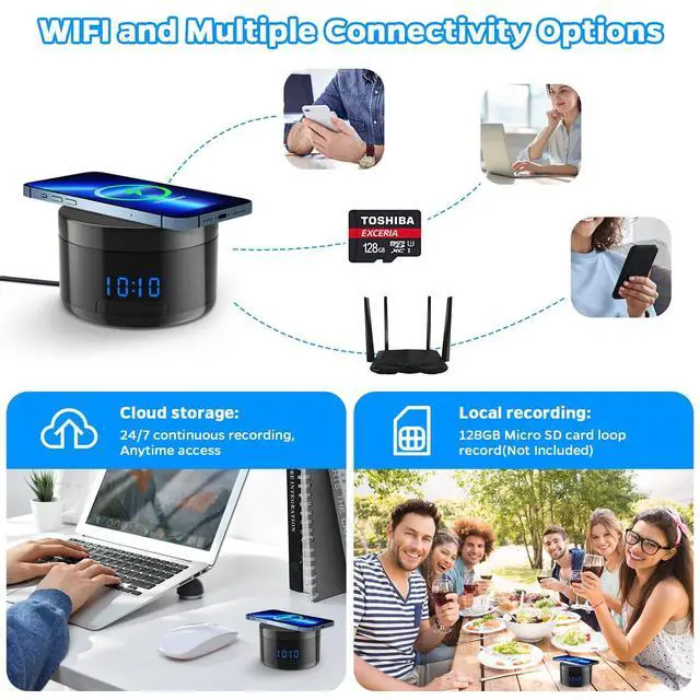 Indoor Camera with Clock and Wireless Charging, 1080P WiFi Cameras for Home, Security Camera with Motion Detection, Night Vision, Local & Cloud Storage, with APP (Black)