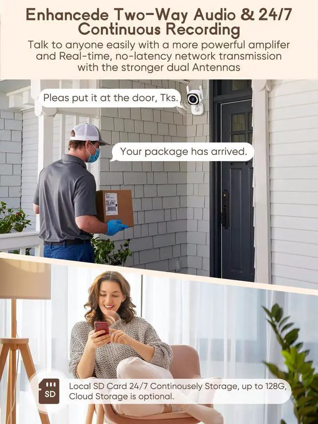 5G External Antennas Provide Stronger SignalsThe outside camera for home security is equipped with 5G external antennas provides stronger and more stable connection. Install the wifi security camera in places such as the garden, front porch,garage, kitchen, living room, baby room, etc. to ensure home's safety.