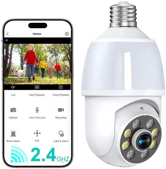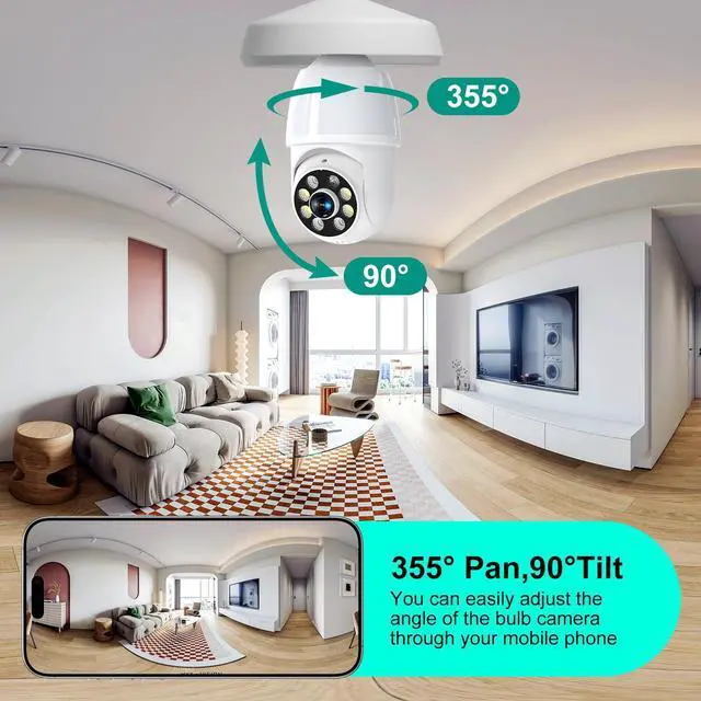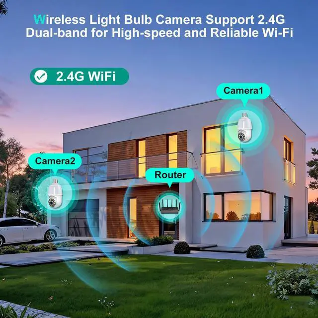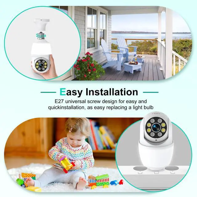 Easy Installation, WiFi ConnectionThis wireless light bulb camera supports 2.4G and reliable Wi-Fi, it has stronger signal reception, higher stability, longer distance to use, no lag and smoother real-time video compared to traditional 2.4G single-band light bulb camera. This WIFI bulb camera support E27 bulb socket(AC110-240V), easy to install anywhere, download the Esceecloud APP and simply connect bulb camera 355 degree wifi outdoor to your home wifi.