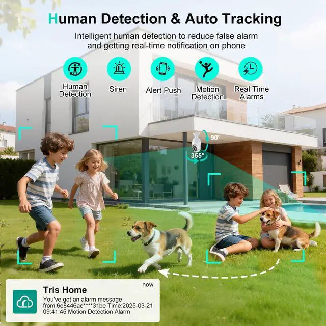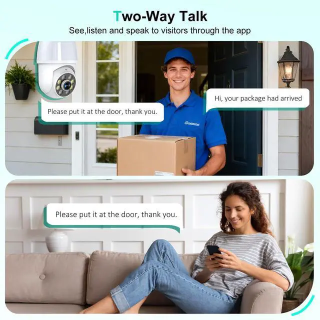 Two-Way Talk & Real-Time AlarmThe light bulb camera outdoor has a built-in microphone and speaker, supporting two-way language real-time talk, you can communicate with anyone outside using the App, even when you're away from home. The light socket security camera supports real-time alert with intelligent human identification, it will send you real-time notifications when it detects any motion, maximizing the security of your home and property.