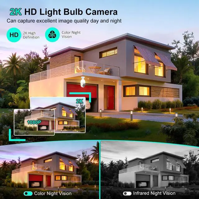 2K Ultra HD & Colour Night VisionCamera light bulbs outdoor with 2K Ultra HD resolution can capture excellent image quality day and night, allowing you to easily identify faces and details. Lightbulb camera wifi outdoor supports color/infrared night vision, security cameras wireless outdoor can clearly monitor objects in low light environment, excellent night vision experience ensures your home safety 24/7.