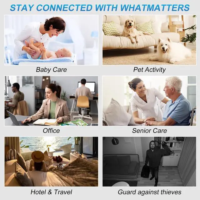 Continuous Recording & Multi-Scene ApplicationThe camera indoor never stops recording. When the memory card is full, the newest files will overwrite the oldest, ensuring that the camera never misses anything important. You can use the mini camera charger to monitor the growth of your pets and children, and you can also take care of elderly individuals, guard the family, protect the garage, prevent theft in the office.