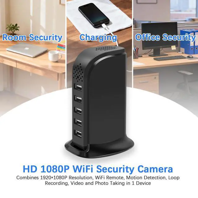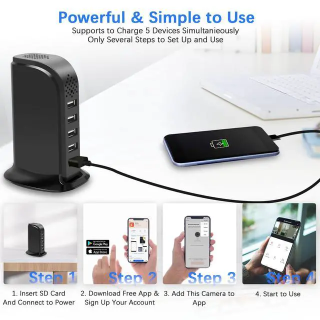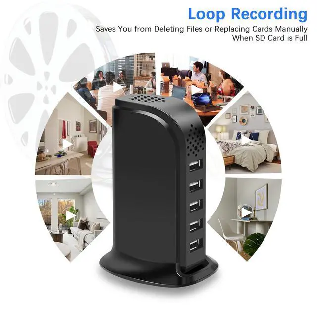 Shaped of a USB charger, this wifi security camera allow you to monitor your home in a covert way without draw other's attention. Besides, the wireless security camera indoor equipped with 5 charging ports, which allow you to charge 5 devices simultaneously. (Doesn't support fast charging)