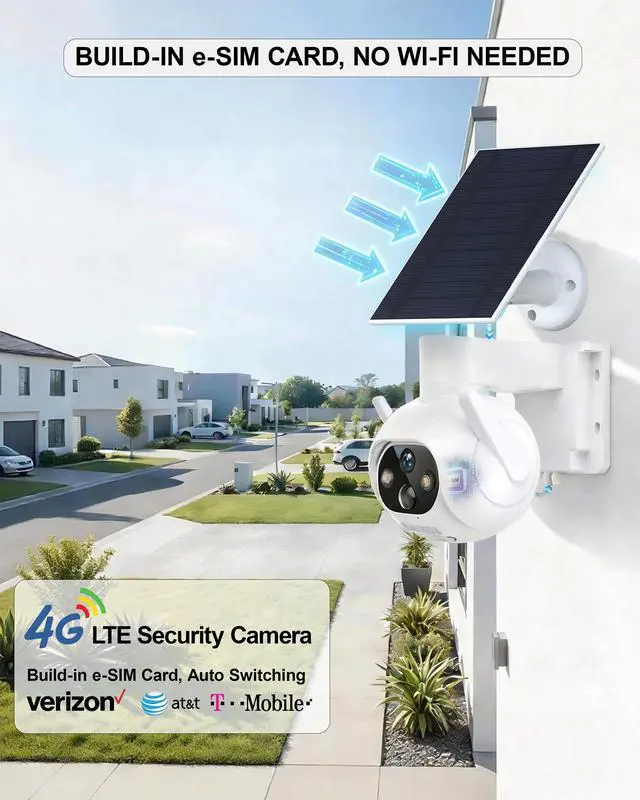 This camera features a built-in eSIM that automatically connects to major U.S. carriers, including Verizon, AT&T, and T-Mobile, selecting the strongest available signal for stable performance. No physical SIM card is required.