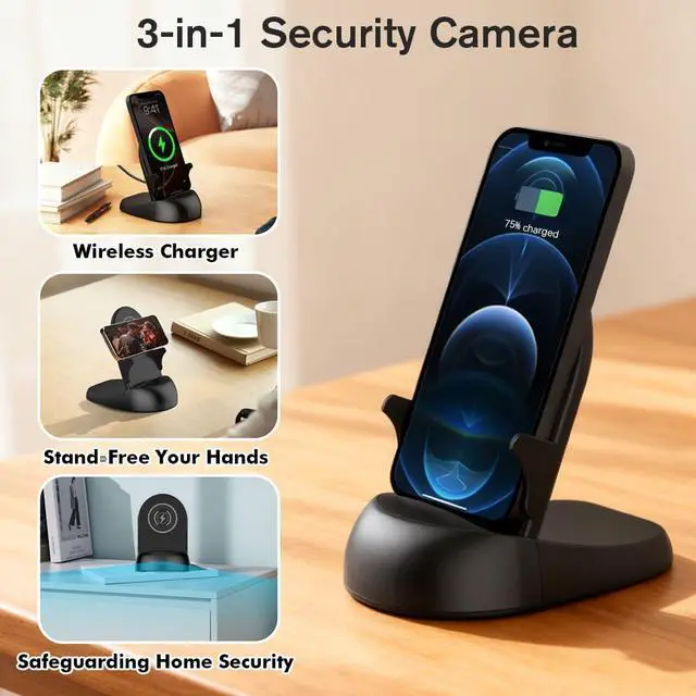 3-in-1 Security Camera This multi-functional camera combines a security camera, wireless charger, and phone holder in one. The built-in security camera blends seamlessly into your daily life, while also functioning as a wireless charger. No one will doubt that this unassuming accessory is actually a powerful spy camera, monitoring your home, office, or nursery 24/7 for your peace of mind.(12-month warranty. For any issues, please contact our customer service.)