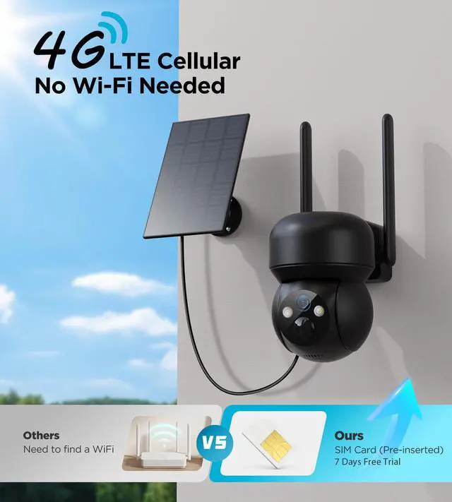 NO WIFI & 100% WirelessThis 4g solar security camera built-in sim card and no annoying lines, easy to install. This 4g wireless security camera just need to connect to the solar panel can work 365 days non-stop, protect your safety. This outdoor camera has a built-in SIM card (non-removable), so you no longer need to worry about the outdoor camera disconnecting.This 4G cellular camera comes with a 7-day free data trial period. After the trial period, you will need to subscribe to a data plan through the Cloudplus app to continue using it.Choose TOAIOHO battery operated wireless security cameras and your family's safety is no longer a concern.