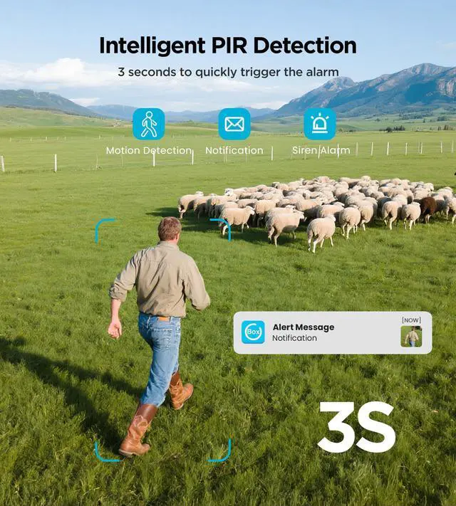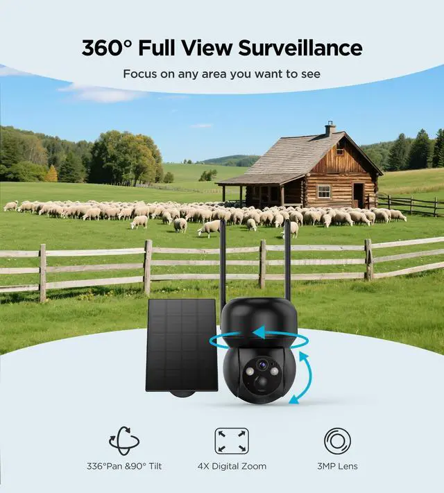 Upgraded Rechargeable Battery & Solar PowerThis security camera outdoor wireless has a built-in 7800mAh battery and 3W solar panel. The solar camera outdoor ensures that only 3 hours of direct sunlight per day is enough to provide the camera with the power it needs to operate. Even on cloudy days with no sunlight, This home security camera no wifi's built-in 3 energy-saving batteries provide long hours of operation, avoiding the hassle of removing your camera to charge it indoors. Enjoy uninterrupted home security with our security camera outdoor.