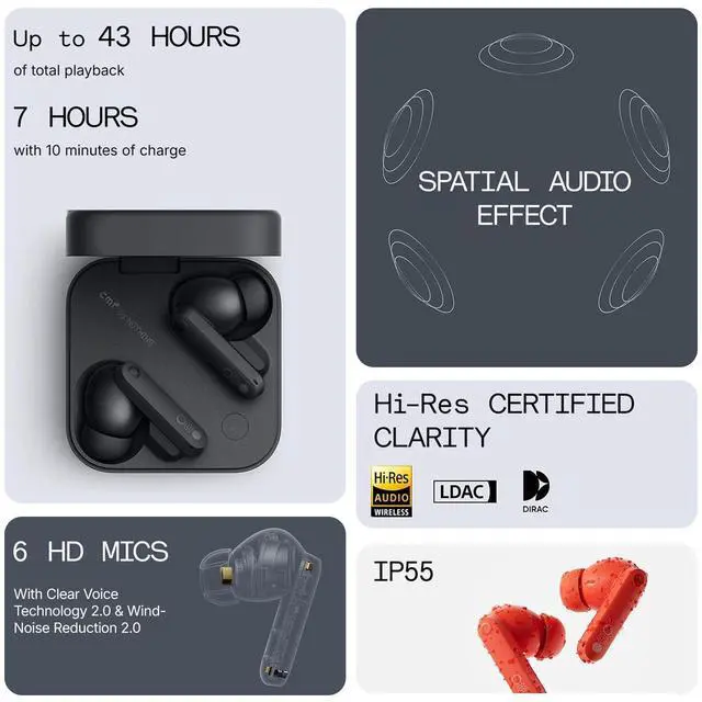 Engineered for audiophiles and active lifestyles with studio-quality sound, these true wireless earbuds featuring Hi-Res Audio Wireless certified LDAC technology tripling transmission bandwidth for lossless detail combined with Ultra Bass Technology 2.0 that dynamically enhances lows while preserving crisp mids/highs. And customization EQ including bass across 5 levels are supported via the Nothing X app.