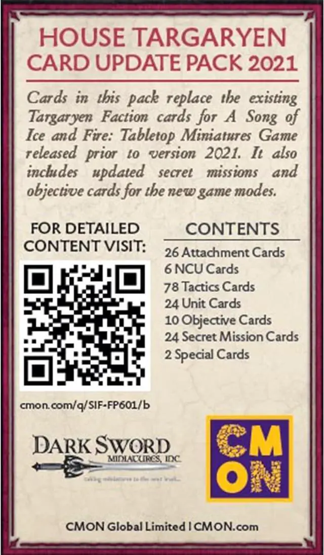 TARGARYEN FACTION: This faction pack includes updated cards for releases before the 2021 version that are required for tournament play and includes the revamped secret mission and objective cards for the new game modes. Players should use cards in this pack to replace their existing attachment, unit and tactics cards.