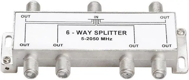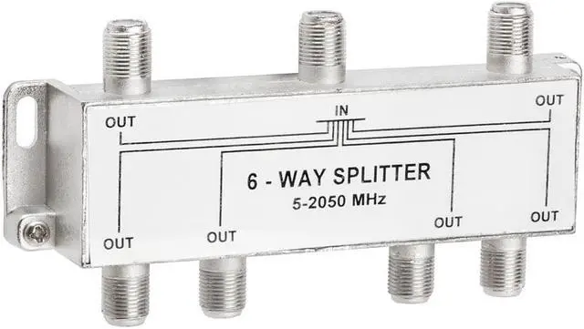 This 6-way Signal Splitter splits a coaxial video signal from cable TV, antenna or a VCR for connection to 6 TVs/VCRs.