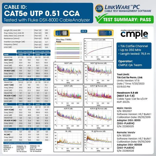 Cmple Cat5e bulk cable supports high-speed data transfers from 10 to 1000 Mbps (1 Gigabit) with bandwidth capabilities up to 350 MHz over 328 feet. It's ideal for powering devices like PoE (Power Over Ethernet) systems, computers, routers, IP cameras, switches, keystone jacks, RJ45 connectors, modems, gaming consoles (Xbox, PlayStation), Apple TV, Ethernet adapters, fax machines, smart TVs, mesh networks, access points, CCTV setups, and more. With the IEEE 802.3bz standard, it can achieve speeds up to 5Gb over shorter distances (2.5GBase-T and 5GBase-T).