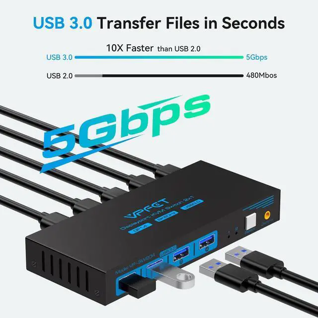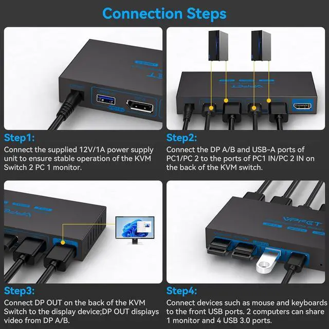 To drive peripherals with a maximum power of 10W, we use a 12V/1A power adapter, which can provide a more powerful and stable drive. Other KVM switches only support 5V/1A adapters. When using high-power