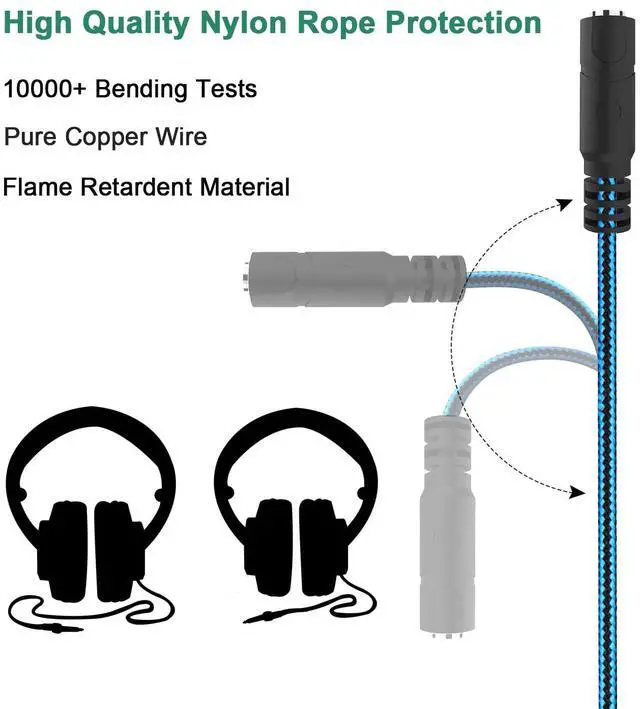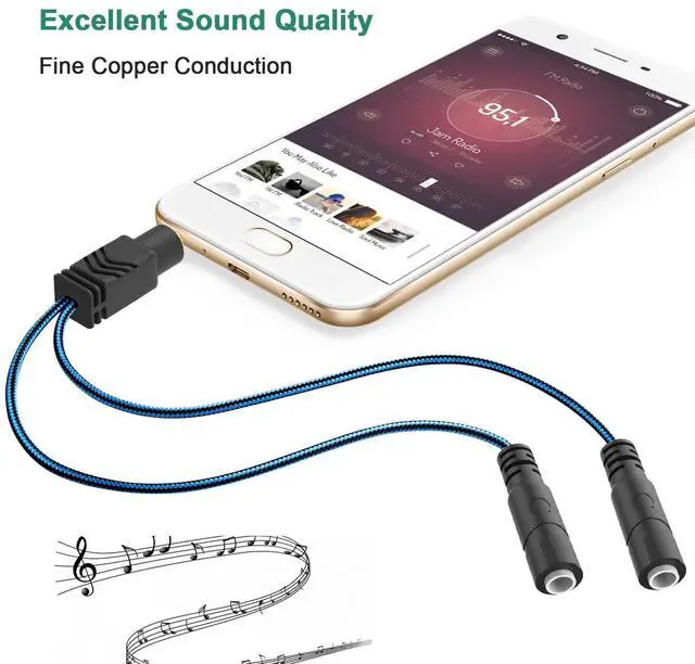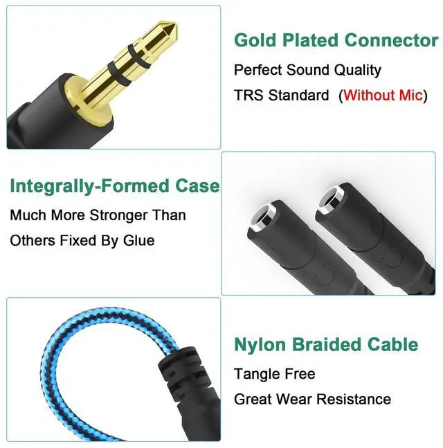 1 to 2 Stereo Splitter Cable: Dual Headphone Jack Adapter delivers undiminished stereo sound to both 3.5mm female jacks. With the combination of gold-plated connector, bare copper conductors, and 3-layer solid shielding(including enameled copper, tinned copper and TPE jacket), the 3.5mm Audio Splitter provides superior performance and offers high-fidelity, ultra-clear and noise-free stereo audio.