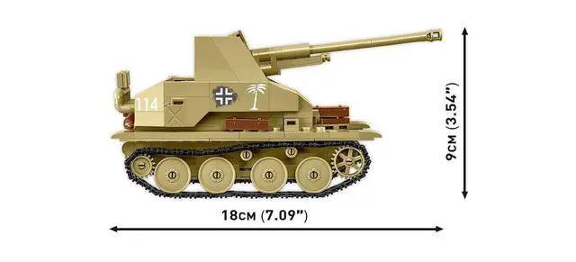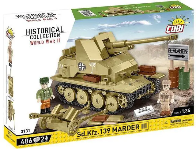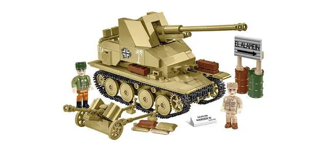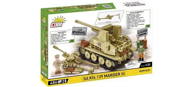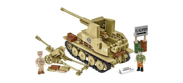 MARDER III with the basic German 5cm Pak 38 cannon included in the set was developed in a 1:35 scale matching the figures and consists of 486 construction blocks. There are no stickers here, we only use high-quality, durable prints. The model's functionalities include working traction caterpillar, rotating wheels, space for a figure in the fighting compartment and a movable cannon.