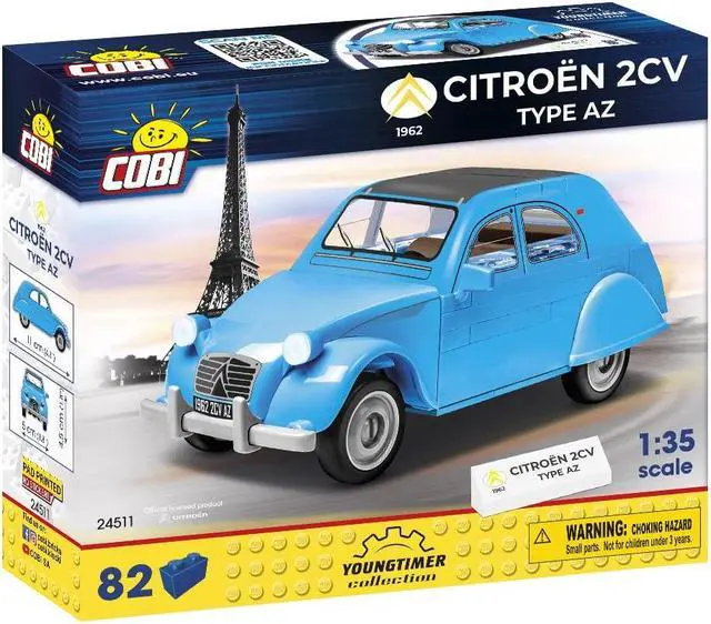 During its 41 years of production, nearly 4 million cars were produced in factories around the world. Today, this car holds an almost cult status and is prized by collectors. The AZ version of the car is a sedan with additional improvements. A characteristic feature was the detachable panoramic roof which could be rolled up. Using 82 COBI construction bricks, you can build a model of the Citroen 2CV type AZ which is impeccably reproduced in 1:35 scale. Thanks to the use of elements specially designed for this car, the shape of the body is as close to the original as possible.