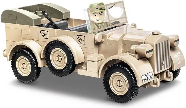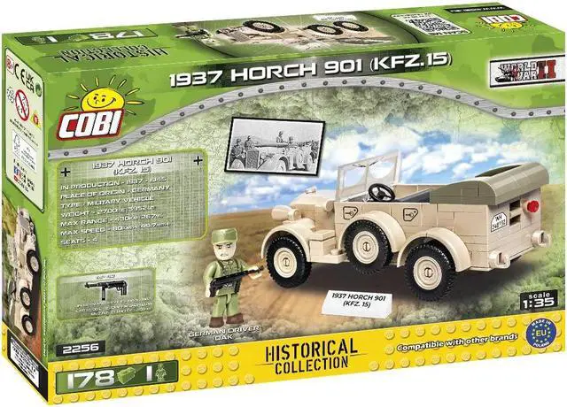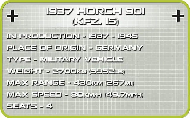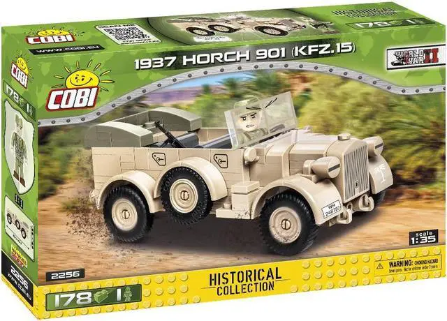 The Horch 901 is a military off-road vehicle used by the German armed forces in the period 1937 until 1945. It was heavily produced (several thousand were made) and became a common means of transport in the army. Initially, the car was intended for the transport of staff officers. Over time, it began to be used as an ambulance for transporting the wounded, communication vehicle, light artillery tractor, and to supply and transport soldiers. Using a set of 185 COBI construction blocks, you will build a military passenger car Horch 901 (Kfz.
