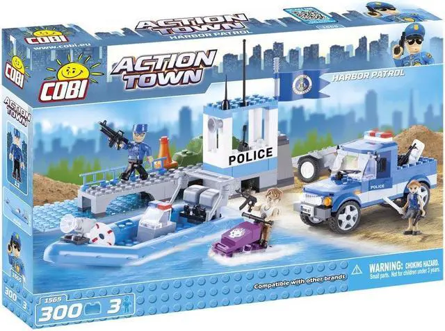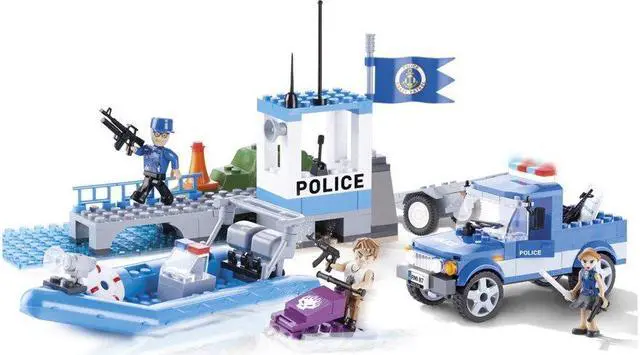 harbor police station, a patrol car with a trailer, a pontoon and a water