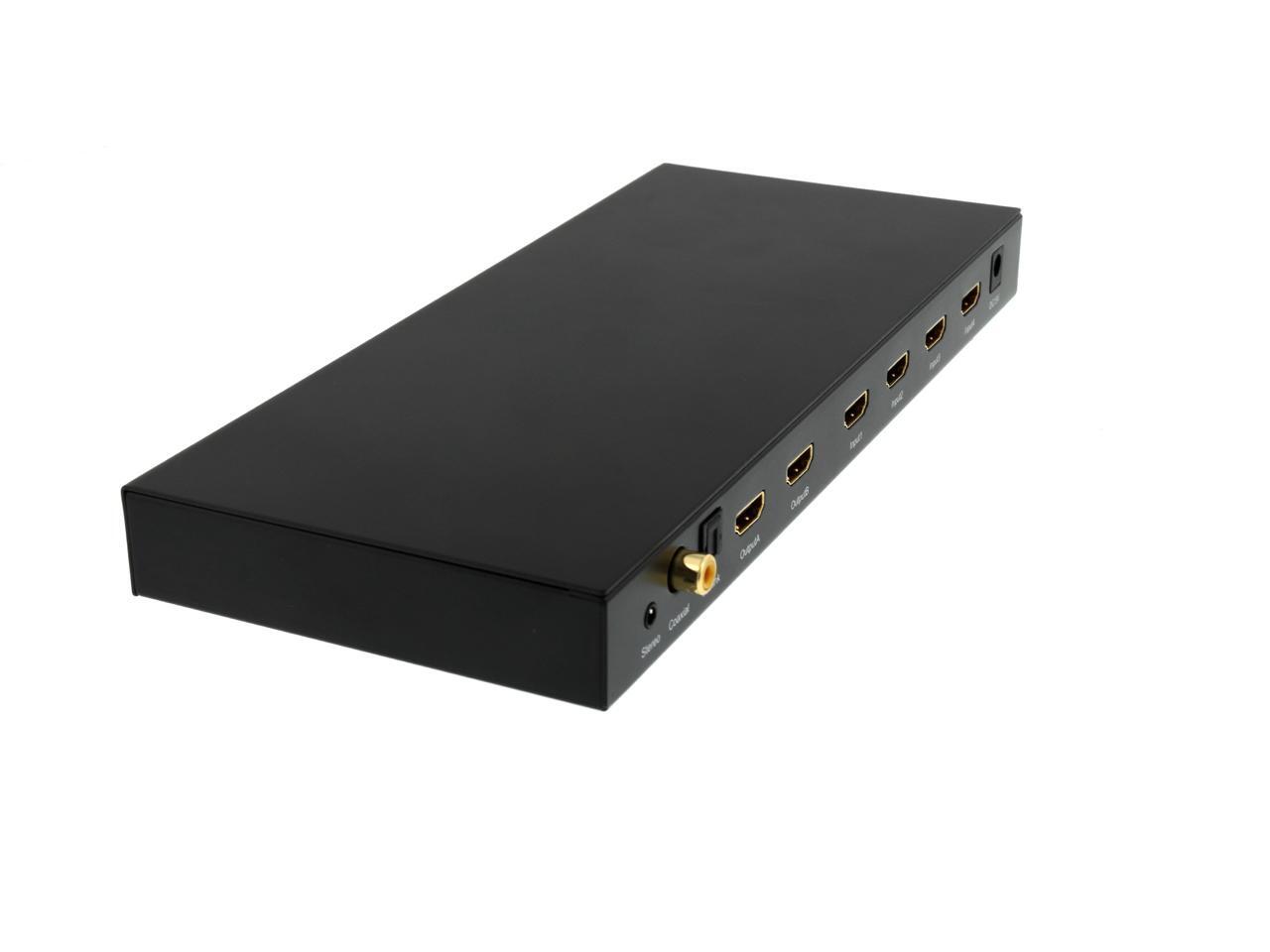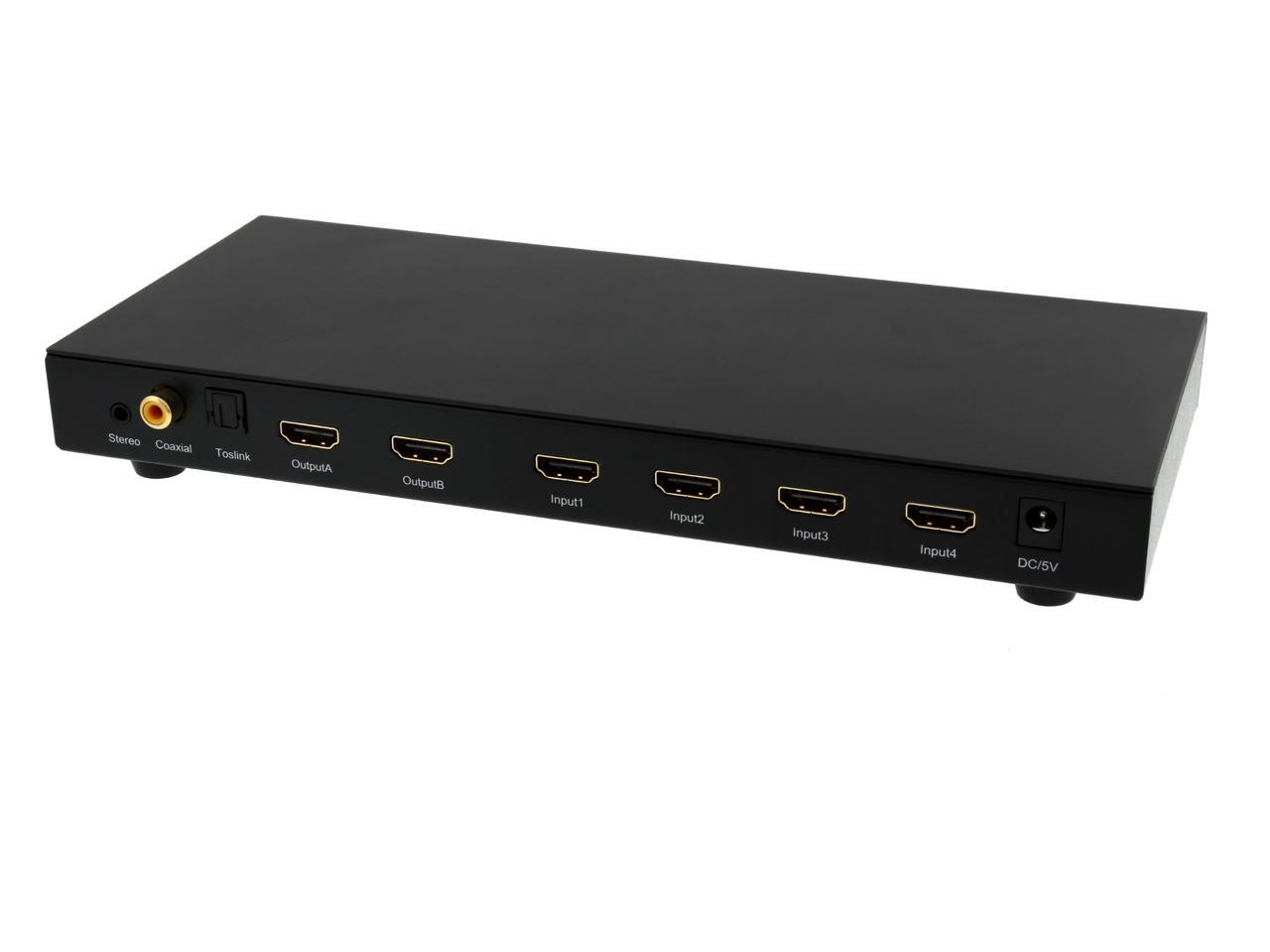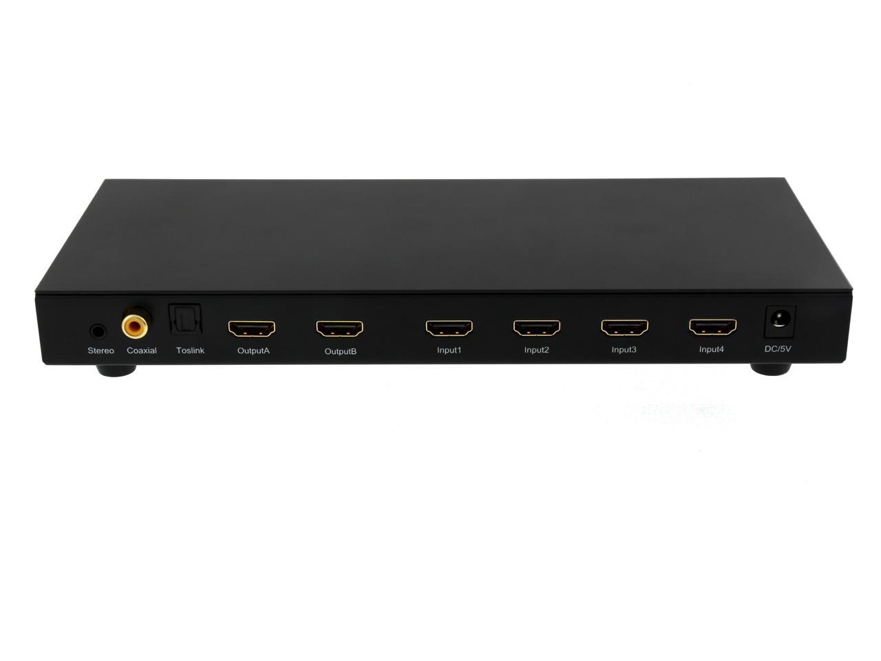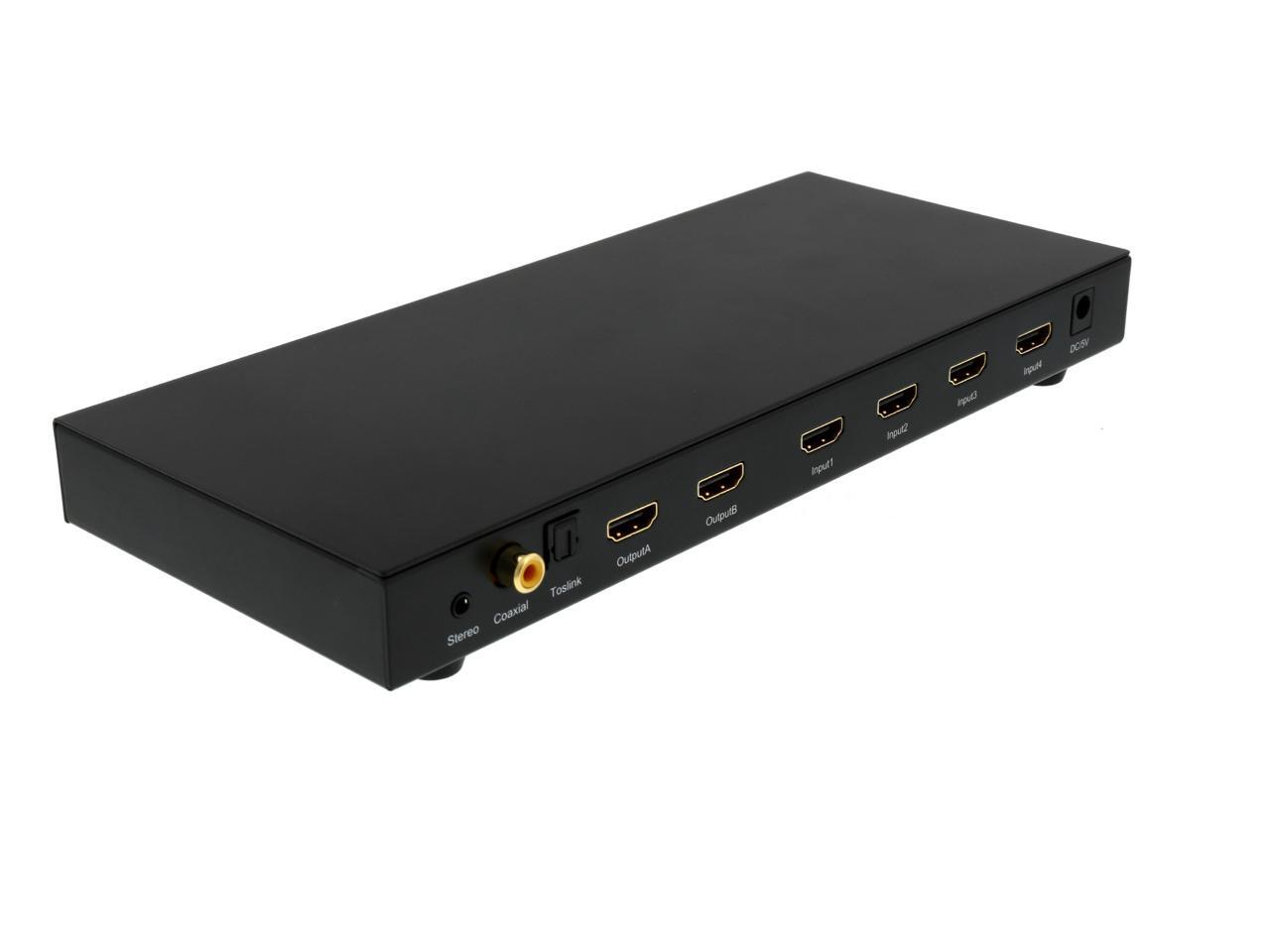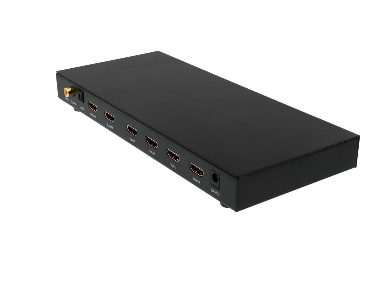 Features Switch HDMI video and digital audio between the four Input HDMI sources,and distribute to two display independently