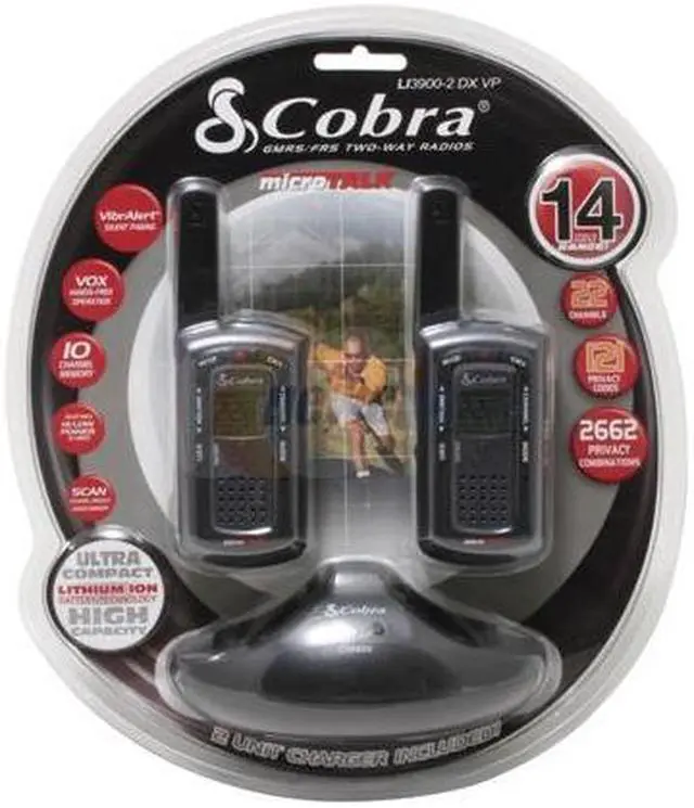 Perfect for Outdoor CommunicationFeaturing an extended 14-mile transmission range and water resistant capability, the Cobra LI39002DXVP delivers unlimited, cost-free communication and high reliability, perfect for outdoor use.