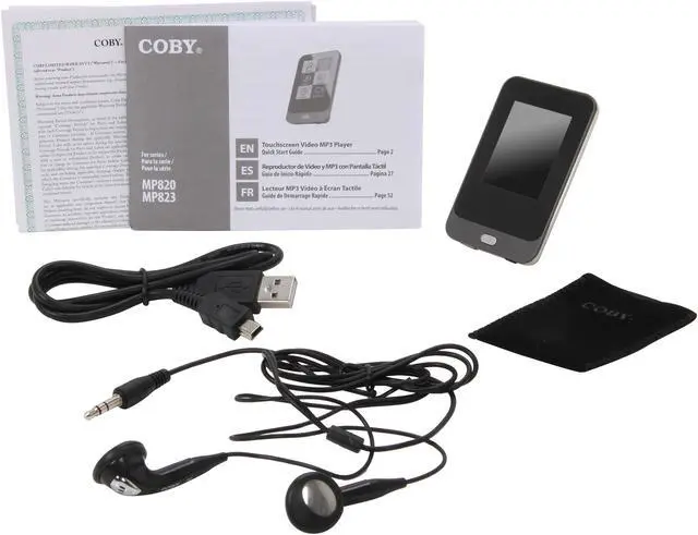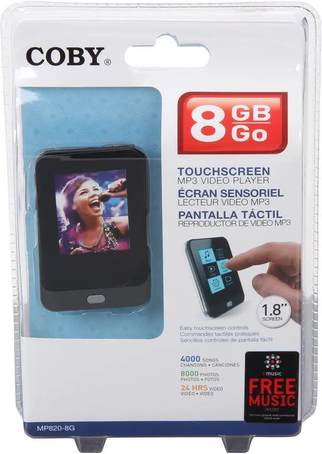 | Additional Features | Use your fingers to browse and play your media library Stores 2000 songs, 4000 photos, or 24 hours of video Auto Syncs with iPhone/iPod Clock ID3 and LRC support for song and synchronized lyric information display World clock and calendar apps included Coby Media Manager software included OSD Menu Languages: English, Spanish, French, Portuguese, Italian, German Certifications: CE, FCC |