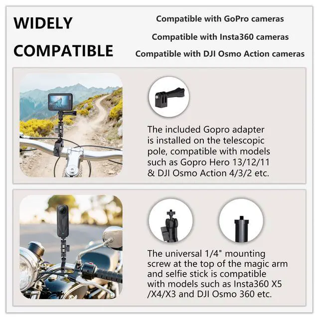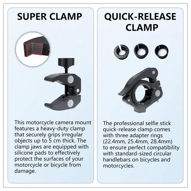 Wide Compatibility & Secure Mounting System Featuring a 1/4" universal screw, this 360 camera mount is fully compatible with Insta360 X5, X4, X3, X2, ONE RS, GO 3, DJI OSMO Action 5/4/3, Pocket 3, GoPro Hero 137, and most action cameras. The dual clamp design fits round, square, and irregular tubes from 0.5" to 1.77" (1345mm), making it a versatile Insta360 motorcycle kit and GoPro handlebar mount. Anti-rotation technology and silicone inserts ensure your camera stays locked in place, even on bumpy rides
