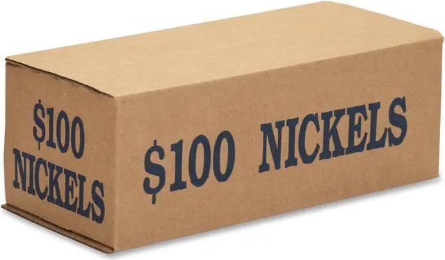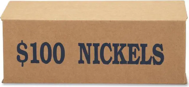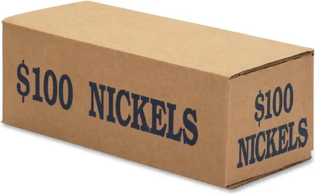Coin transport boxes for nickels are made of strong corrugated material and printed with the total dollar amount of contents. Sturdy tuck-type lid keeps closed during transport. Boxes are stackable. Each box is color-coded to Federal Reserve and American Banking Association (ABA) standards.