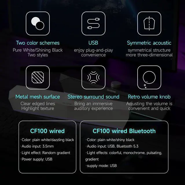 CF100 wired Color: plain white/dazzling black Audio input: 3.5mm Light effect: Random gradient Power supply: USB